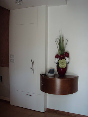 Il tema dell’ingresso è stato l’iniziale motore del progetto. In luogo dell’ampio atrio che traguardava il portoncino d’ingresso si è progettato un mobile divisorio che ne racchiudesse la vista dall’interno. Il mobile, ripartito in un settore con mensole a giorno e in un settore di contenimento, ha risolto il senso di incompiutezza dello spazio. Il retro del mobile rivolto verso il portoncino è divenuto una vera e propria parete a cui addossare specchio e tavolino. Di fronte all’ingresso lo spazio inutilizzato della nicchia è stato tamponato con un mobile su misura con funzione di guardaroba e, alla base, cassettone per la legna; un mobiletto ad incastro più contenuto ha risolto la zona telefono. In tal modo i cavi sono stati inglobati completamente nel mobile e la parete più libera e pulita ha conferito un senso di maggiore luminosità all’ingresso.